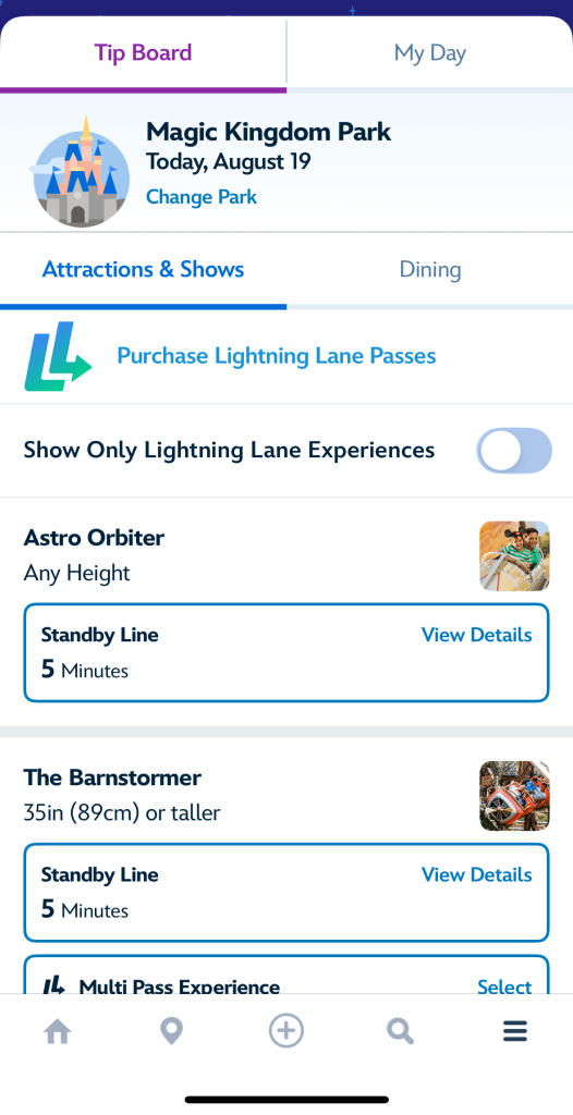 The first thing you will see is your park map. You can toggle which park you are at for that day, to see all attractions, dining locations etc all in one place. One thing that this has that beats a paper map is the ‘Where am I’ feature. The app knows where you are in the park, and can provide directions to an attraction or area of the park you are hoping to get to. The same goes for checking parade times and showtimes on the app. If inclement weather is in the area, you are also able to see if outside rides are delayed while the weather passes.